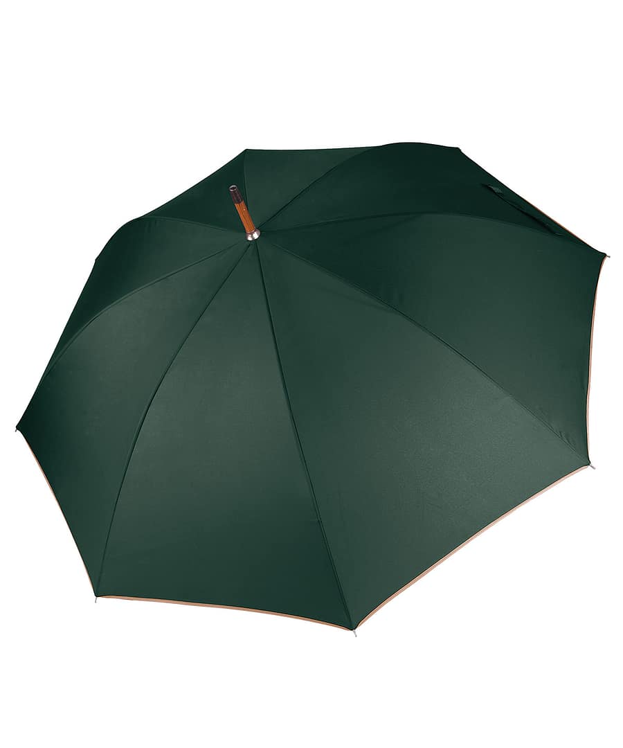 Classic wooden umbrella 23″ (58.5 cm) auto opening, pongee solid fabric, black metal frame, wooden shaft, wooden J handle, white metal tips, 96 cm Ø. BSCI certified.