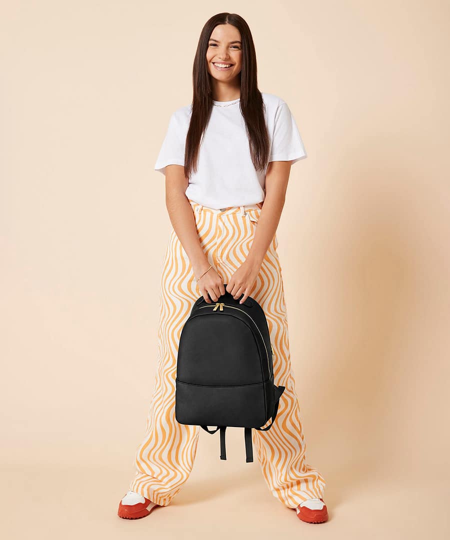 Saffiano fine grain. Zipped main compartment. Internal organisation pocket. Internal water bottle holder. Discreet zipped back panel pocket. Zipped internal valuables pocket. Soft-touch lining. High shine gold metal zips. Wheeled luggage handle strap. Self-fabric adjustable shoulder straps. Grab handle. TearAway label for ease of rebranding.
