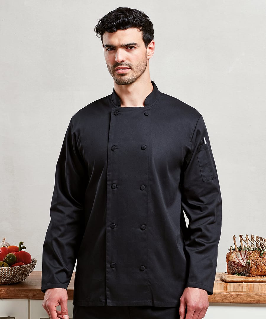 A long sleeve chef’s jacket constructed with Coolchecker® fabric. The centre back panel is made from the Coolchecker® fabric which offers exceptional moisture management and wicking properties so chef stays fresh and cool during service. A wrap over fastening with ten self-fabric buttons, a mandarin collar and a useful double pen pocket on the left…