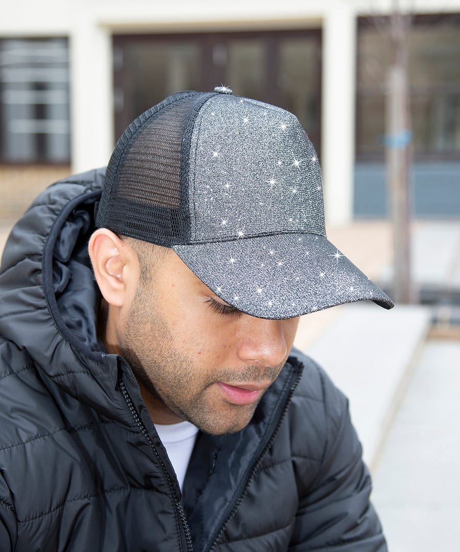 5-panel cap (4 mesh/1 fabric). Sparkle fabric stiffened front panel and peak. Mesh back with ponytail hole. Tear-release adjuster. Semi-curved fabric peak made from recycled plastic. Tear-away label.