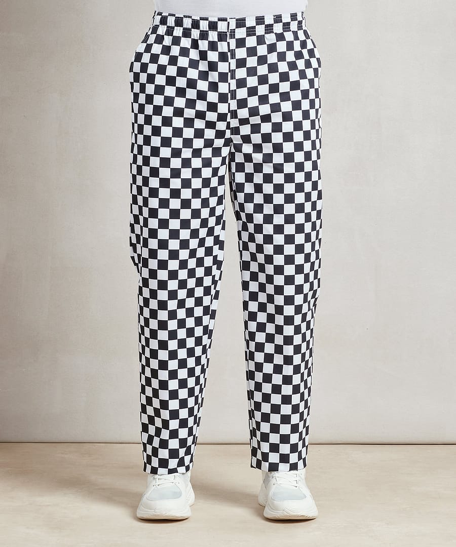 Unisex pull on chefs trouser. Available in Black or White check or plain Black. Elasticated waist for easy pull on trouser. Unisex sizing. 30.5″ inside leg. Side swing pockets. Drawcord.