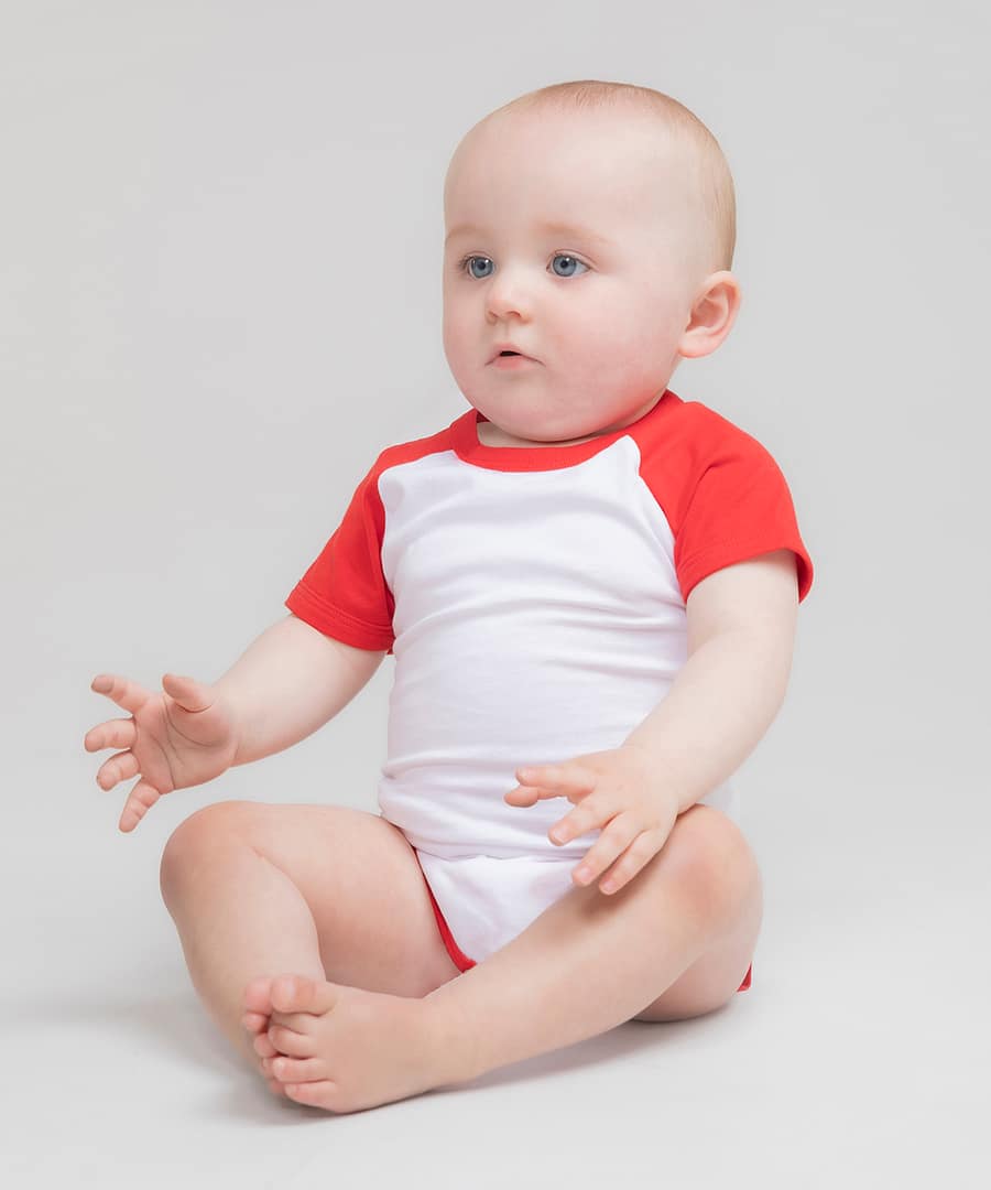 Retro styling baseball bodysuit with contrast sleeves and binding on neck and leg opening. YKK popper fastening at bottom for ease of access and size tab only for easy relabelling.