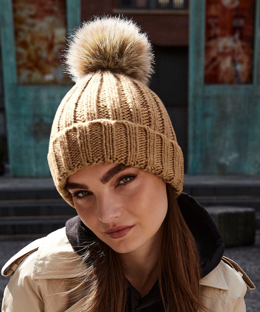 TearAway label for ease of rebranding. Unisex styling. Cuffed design for optimal decoration. Sumptuous heavy ribbed knit. Luxury removable faux fur pom pom for ease of washing.