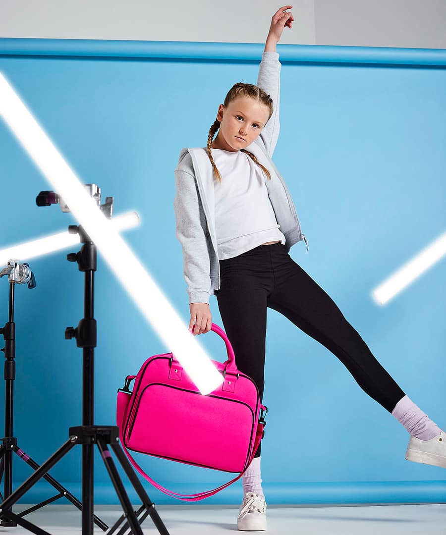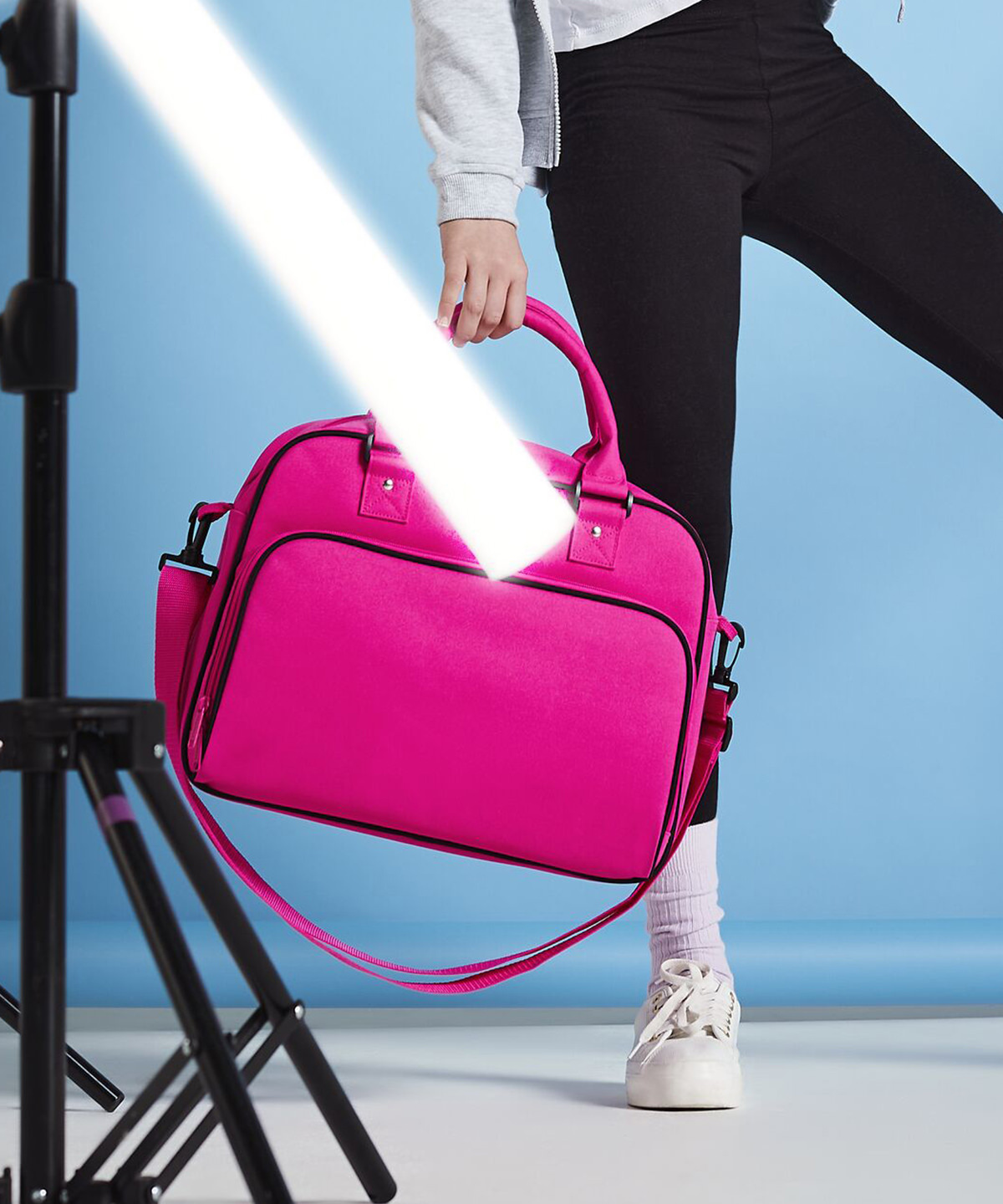 Retro styling. Detachable adjustable shoulder strap. Zippered main compartment. Zippered front pocket. Internal mesh pocket. Internal baseboard. Self-fabric carry handles.
