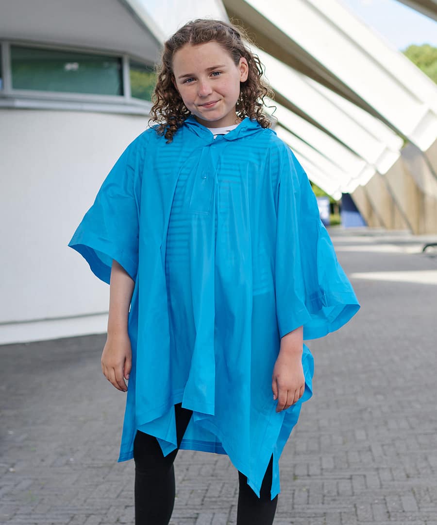 Kids Splashmacs poncho. Hood and popper neck fastenings with a double press-stud fastening on each side, allowing the wearer to open up the cape and lay it flat so it doubles as a useful groundsheet. Carry case, with drawstring handle. Printing Instructions: Can be decorated using screen printing inks, but always without direct heat.