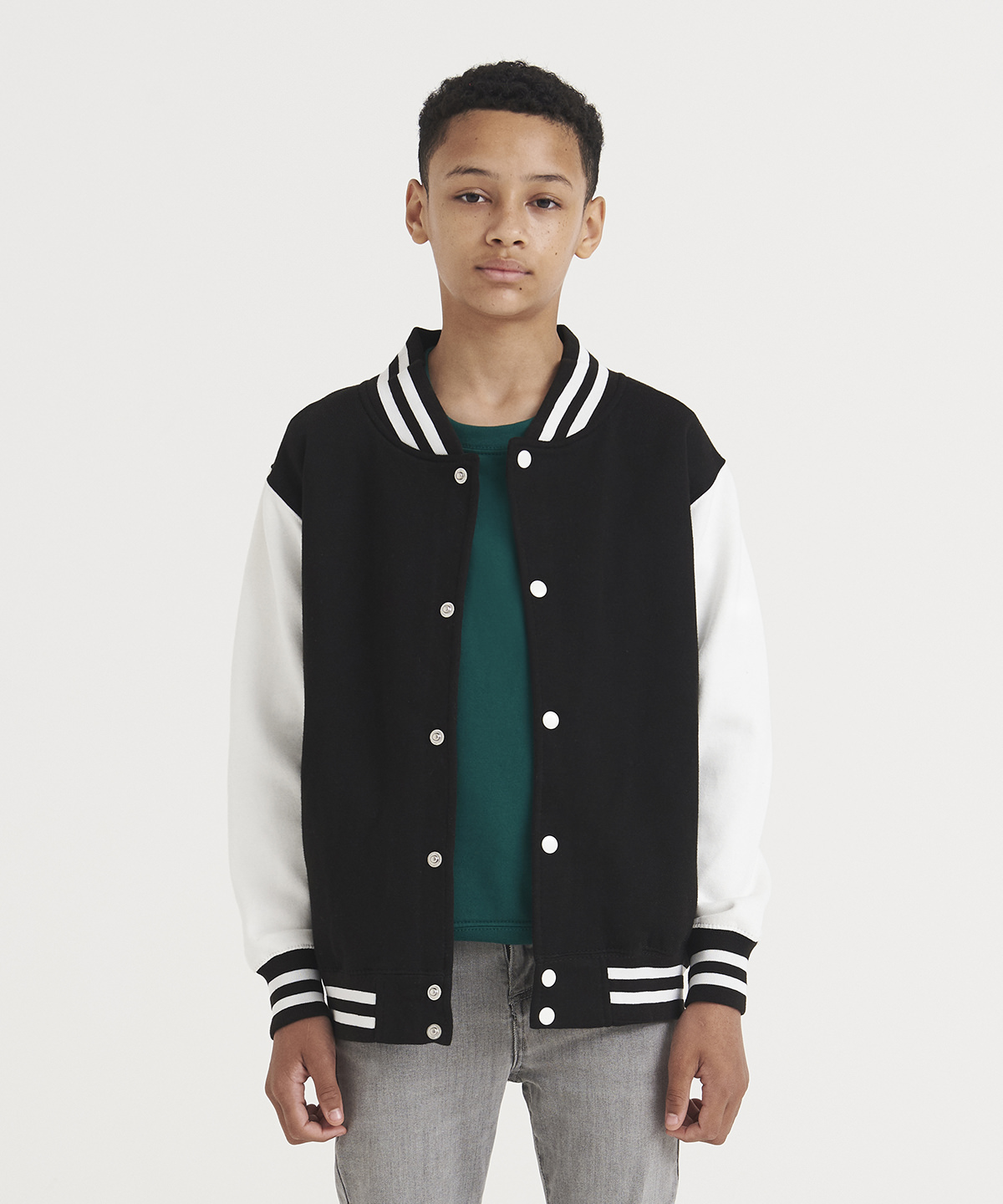 This kids varsity jacket is made in a sporty American style. It features a classic fit with contrast sleeves with excellent front popper fastening.