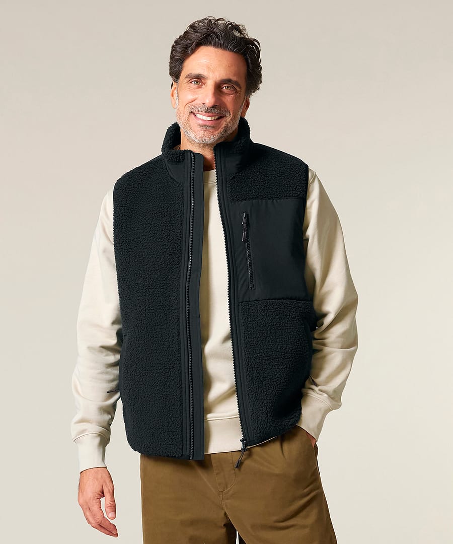 Sleeveless. Elastic recycled binding at cuffs and hem. Inside back neck binding loop and back neck tape. Plastic Vislon zip with metal zip pull and cord ends. Fully bonded inside polar fleece layer with anti-pilling finish. Front side contrast softshell welt pockets with hidden zip closure. Contrast softshell fabric at pocket, back yoke and outer collar band. Inside invisible zip at the wearers left chest for easy decoration.