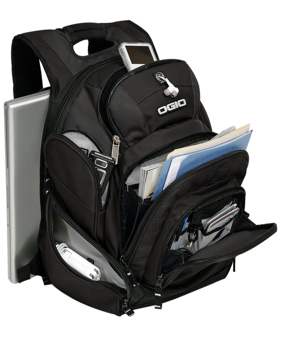 An athletic style with a huge centre compartment and plenty of well-placed pockets keeping active executives ready for anything. Back panel side entry padded laptop sleeve. Front vertical file organiser. Large storage area. Travel essentials sleeve. Power cord and mouse storage. Four large exterior pockets. Neoprene top grab handle. Weatherproof fleece-lined audio pocket with headphone exit port. Sliding sternum strap. Deluxe organiser panel. Heavy duty reinforcements. Reach certified.