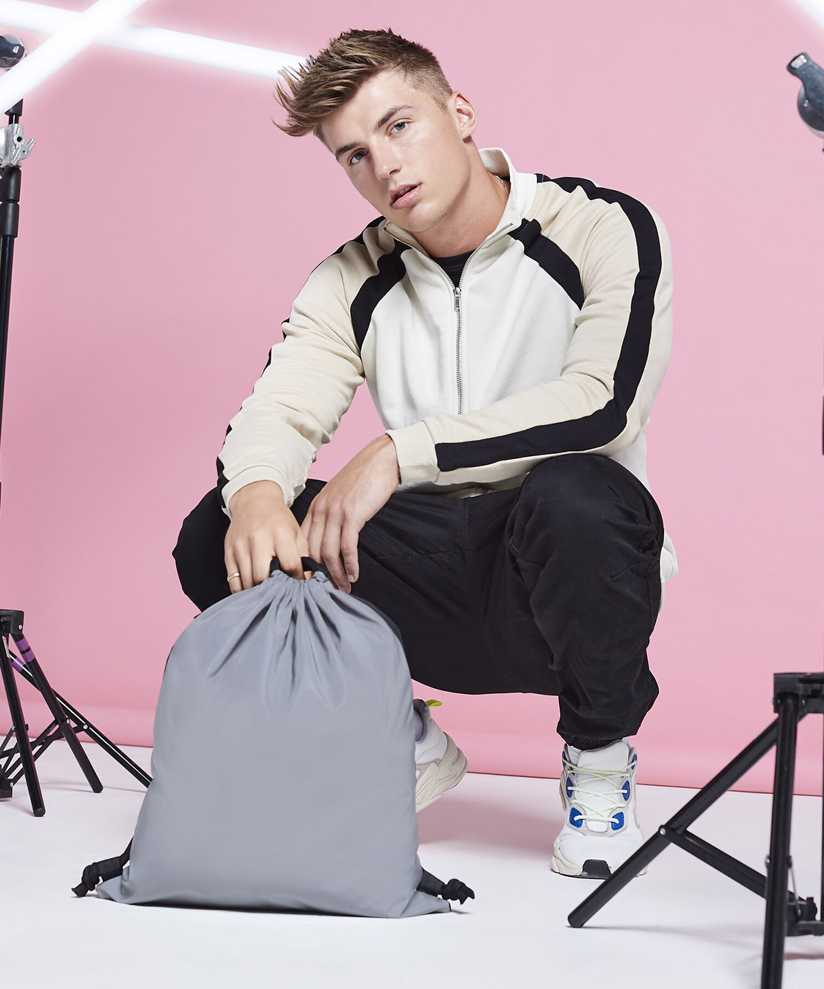 TearAway label for ease of rebranding. Lightweight yet durable. Reflective powder coating for enhanced visibility. self-fabric cord loops for ease of decoration. Zippered external stash pocket. Chunky drawcord closure.