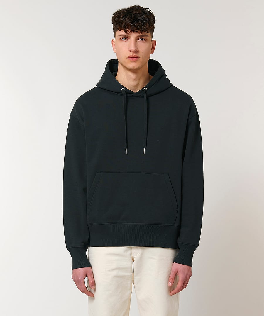 Set-in sleeve. Double layered hood in self-fabric. Flat drawcords in matching body colour with metal tipping. Metal eyelets. Inside single Jersey back neck tape. Self-fabric half moon at back neck. Single needle topstitch at neckline and along hood opening. 2×2 rib at sleeve hem and bottom hem. Armhole, sleeve hem and bottom hem with twin-needle topstitch. Kangaroo pocket at front.