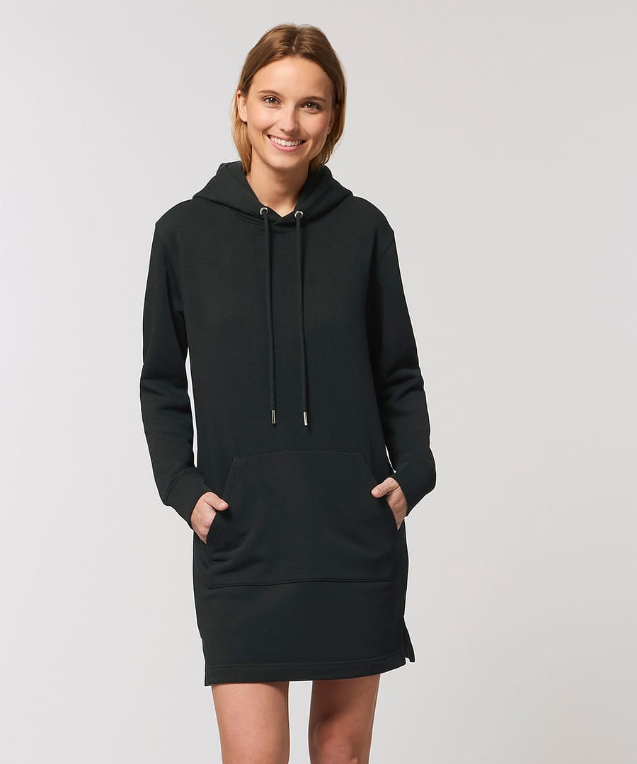 Set-in sleeve. Double-layered hood in self-fabric. Round drawcords in matching body colour with metal tipping. Metal eyelets. Inside herringbone back neck tape. Self-fabric half moon at back neck. Single needle topstitch at neckline and along hood opening. 1×1 rib at sleeve hem. Armhole, sleeve hem and bottom hem with twin-needle topstitch. Kangaroo pocket at front. Slits at side seam.