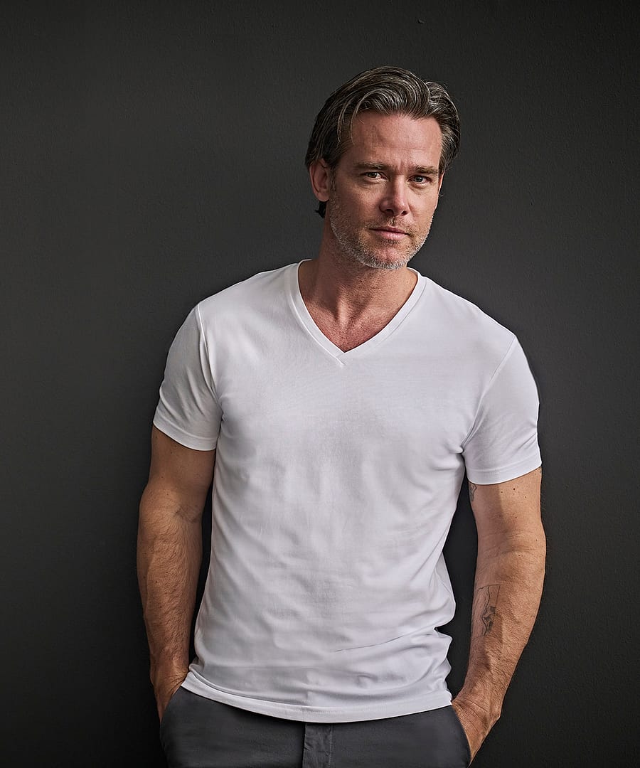 The slim-fitted Stretch v-neck tee features a two-layer slim neck rib and reinforced shoulders.