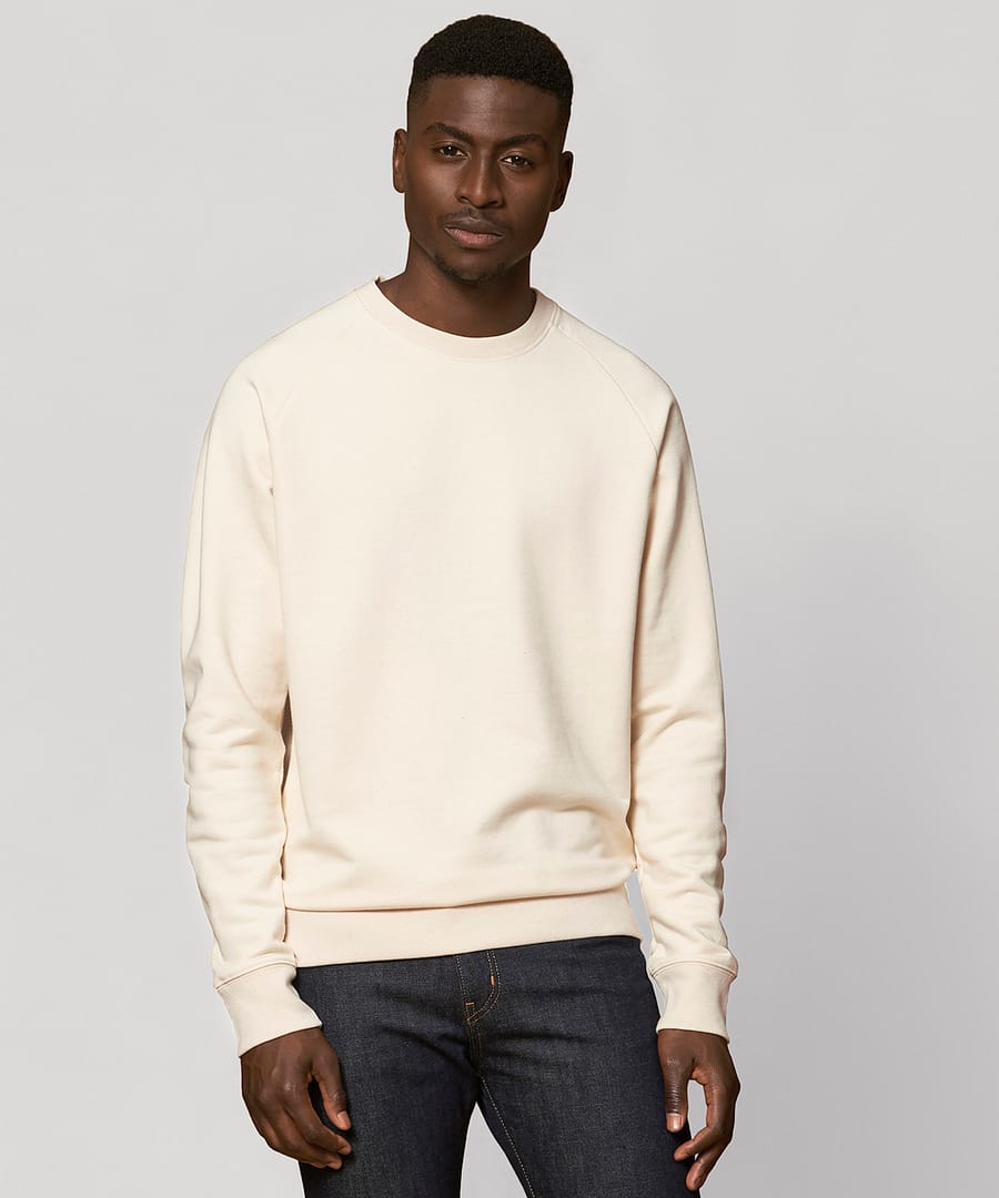 Raglan sleeve. 1×1 rib at neck collar, sleeve hem and bottom hem. Inside herringbone back neck tape. Self-fabric half-moon at back neck. Single-needle topstitch at neck collar. Sleeve hem and bottom hem with twin-needle topstitch. Unisex, medium fit, long sleeve, round-neck. 85% organic ringspun combed cotton, 15% recycled polyester. Terry sweatshirt. Fabric washed, light sueded.