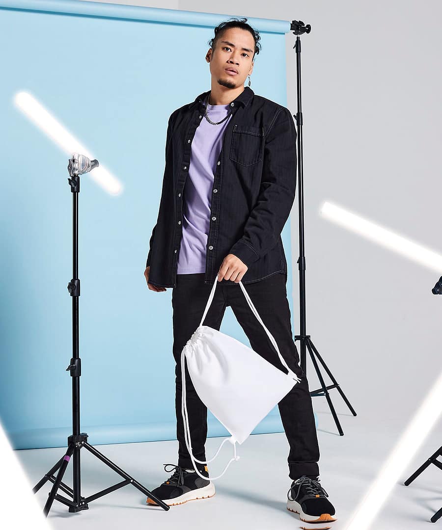 Sublimation friendly A3 size. Can be decorated front and rear. Drawcord closure. Removable cord for ease of decoration.