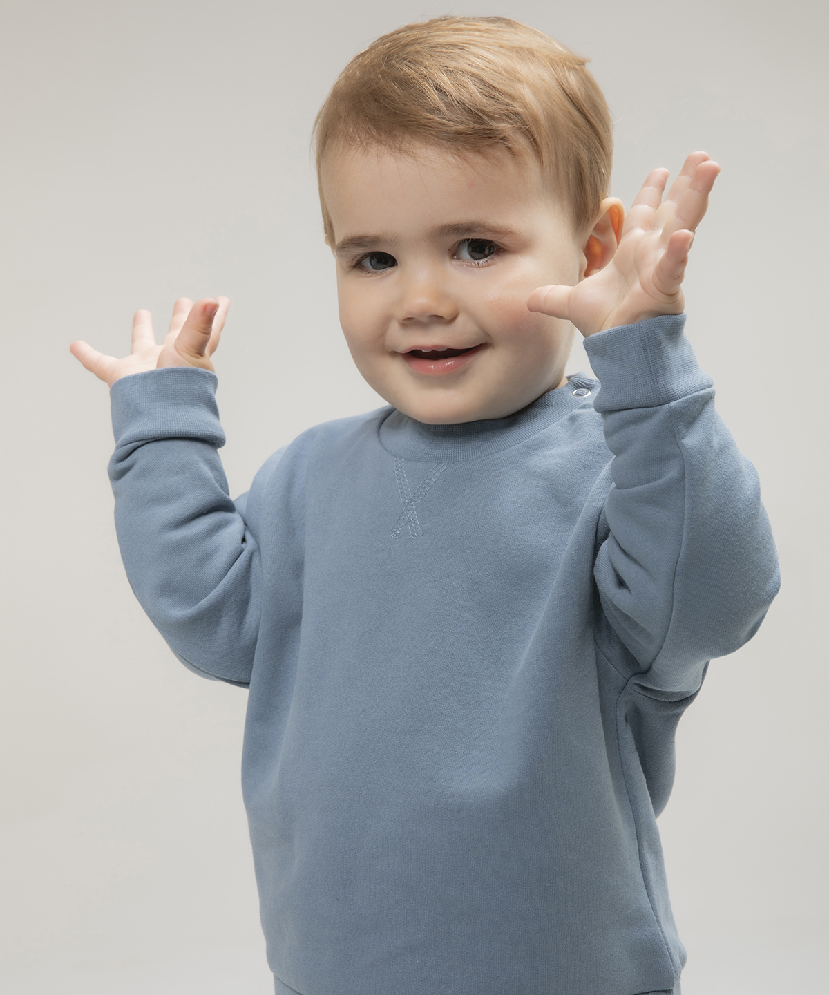 Kids’ sweatshirt made in recycled fabric with self-fabric knitted rib at neck and cuffs. Flatlock V stitching detail at the CF neck. YKK popper fastening on the shoulder on sizes 0/6 – 24/36 only. Tag-free.