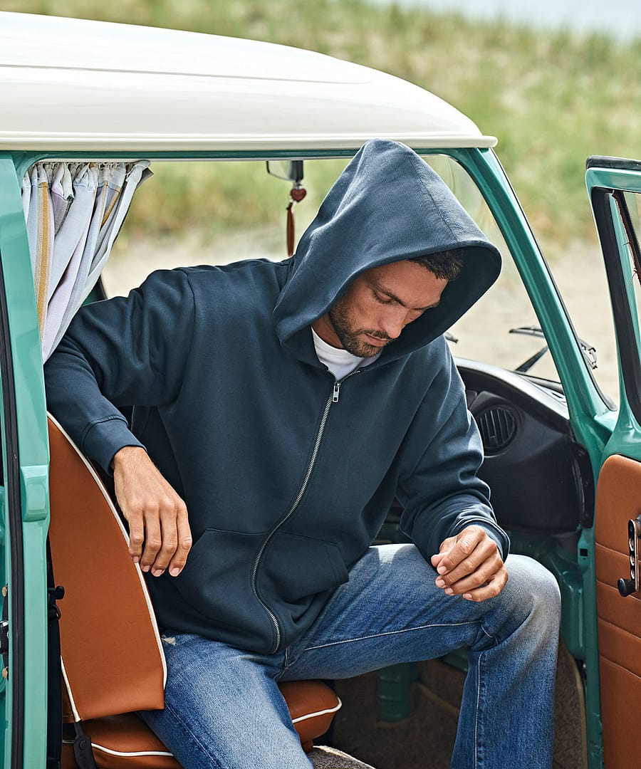 Relaxed fit. Brushed inside. Half-moon for personalised branding. Ribs with elastane and an SBS zip. Double dyed and double pre-shrunk. Silicone treatment. Three-thread fabric. Certified organic cotton and certified recycled polyester.