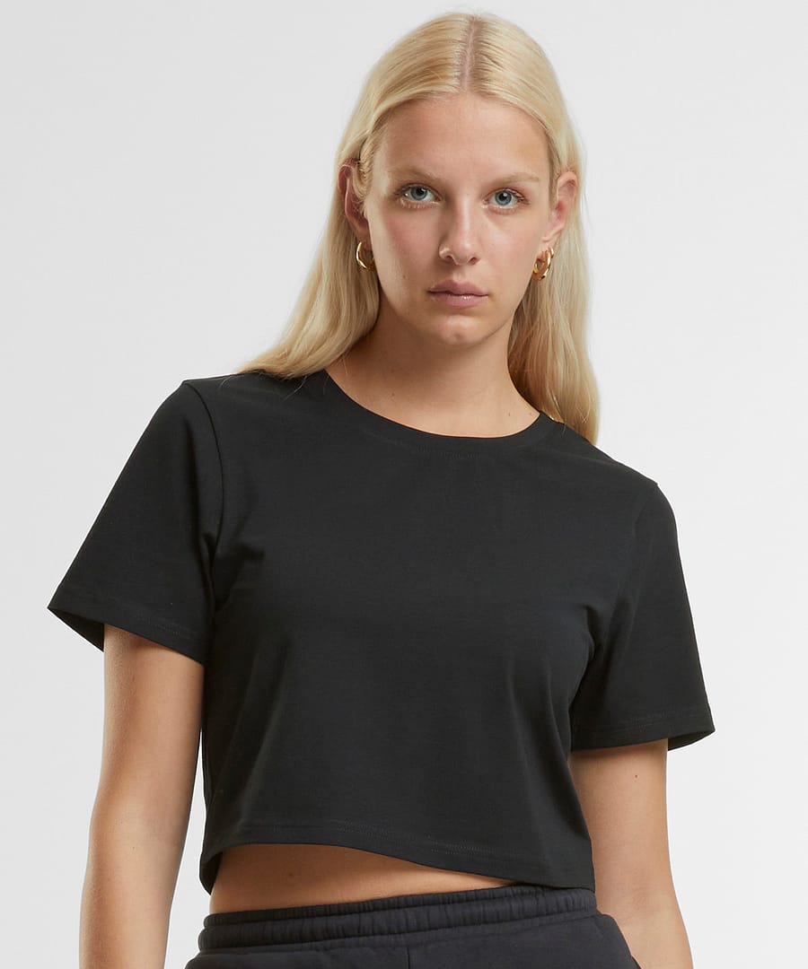 Effortlessly stylish with a loose fit. Modern appeal with a round neckline. Perfectly cropped for a chic look. Simple elegance in a plain pattern. Short sleeves for a casual vibe. 95% Certified organic cotton.