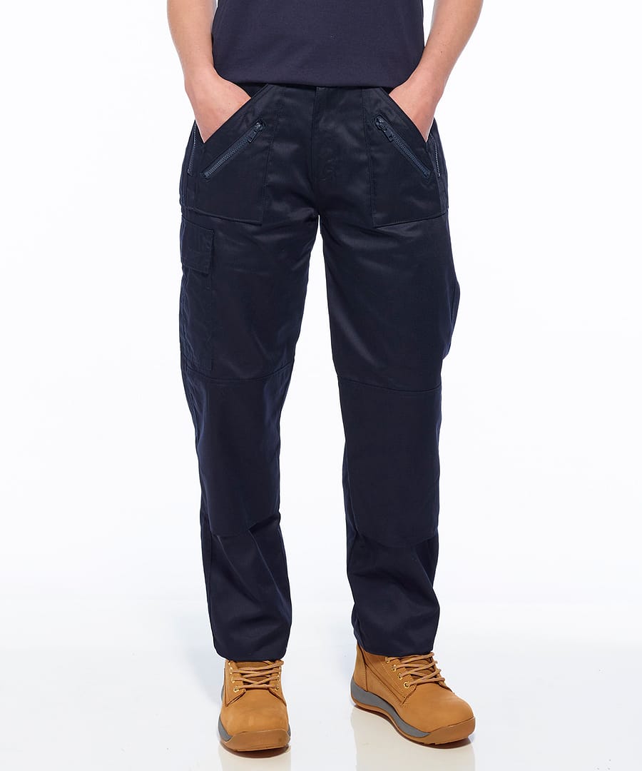 Back elasticated waist for comfort. Multiple zip pockets. Zip fly with hook and bar closure. Double ply fabric on seat for extra wear and tear. Knee pads can be inserted. WRAP certified. SEDEX certified. Oeko-Tex certified. Reach certified.