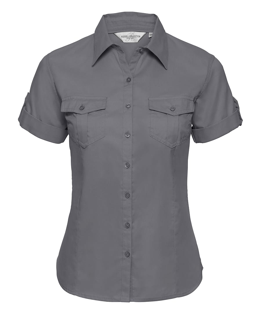 Modern fitted style with chest patch pockets with flap and button and fabric tab to fix rollup sleeve. Semi-cut away, relaxed collar. Button on outer sleeve and fabric tab on inside of sleeve for roll-up effect. Dye-to-match grosgrain patches on side seam hem. Dye-to-match grosgrain tape along neck seam. Rounded hem. Spare buttons.