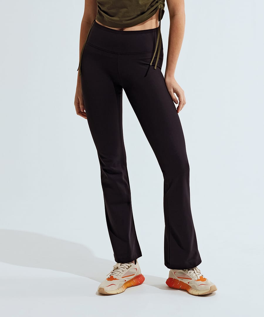 Full-length flared leggings. Soft-stretch fabric. Self-fabric waistband with hidden coin pocket. The product contains no branded neck or waist label. Removable kimble or looped garment tags. The inner seam label holds important product information on one label with a second label containing brand information which can be cut-away. We recommend using block out vinyl and inks.