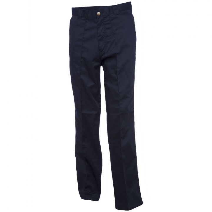 Flat front with sewn-in front crease Two Front Pockets Rear buttoned back pocket Metal rivet button fastening at waist. Twin belt loops reinforced for extra strength. Wide belt loops