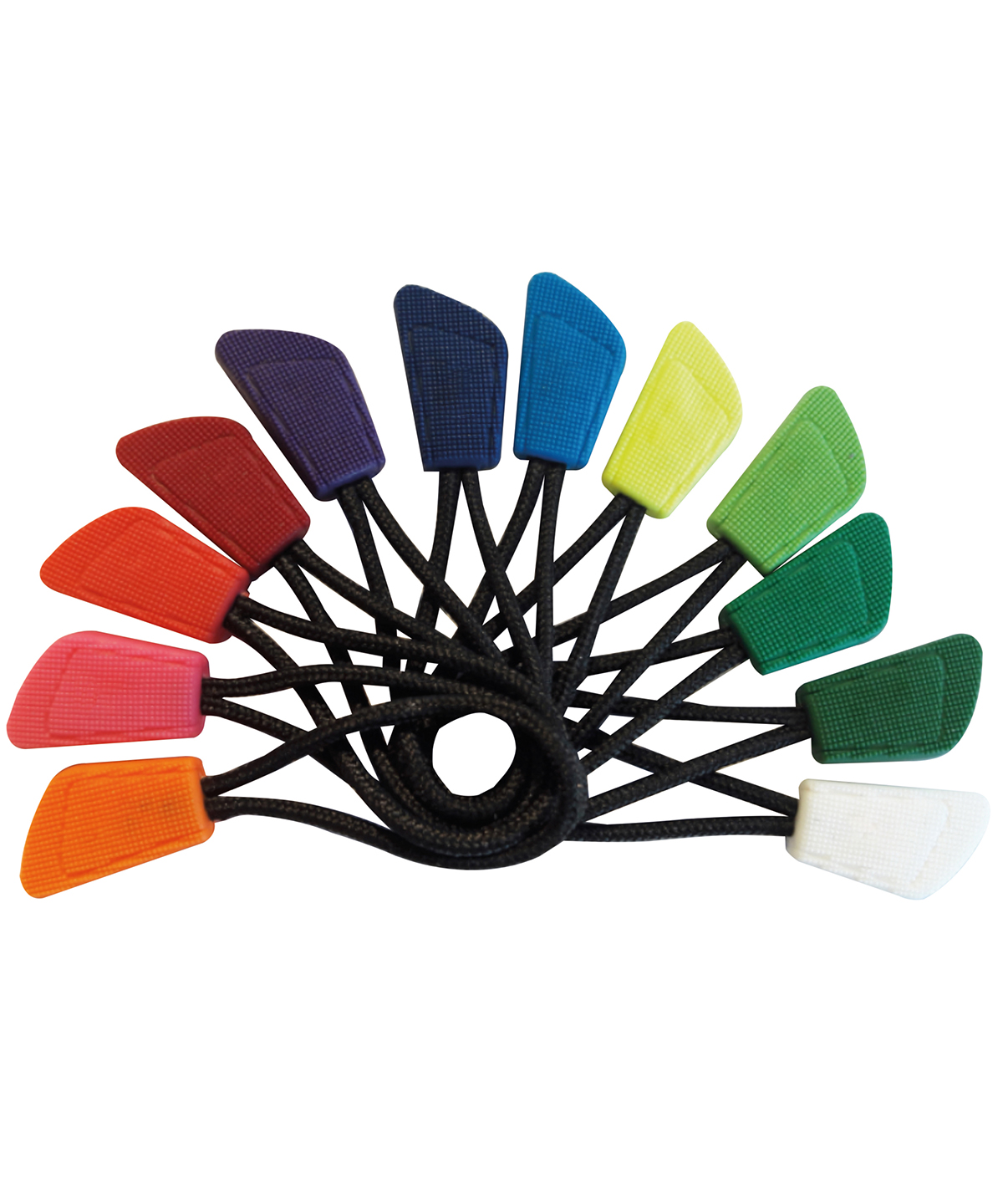 Interchangeable co-ordinates for any Result zip-pull style. Perfect for colour specific solution. Black cord. Coloured toggle. 10 zip pulls per set.