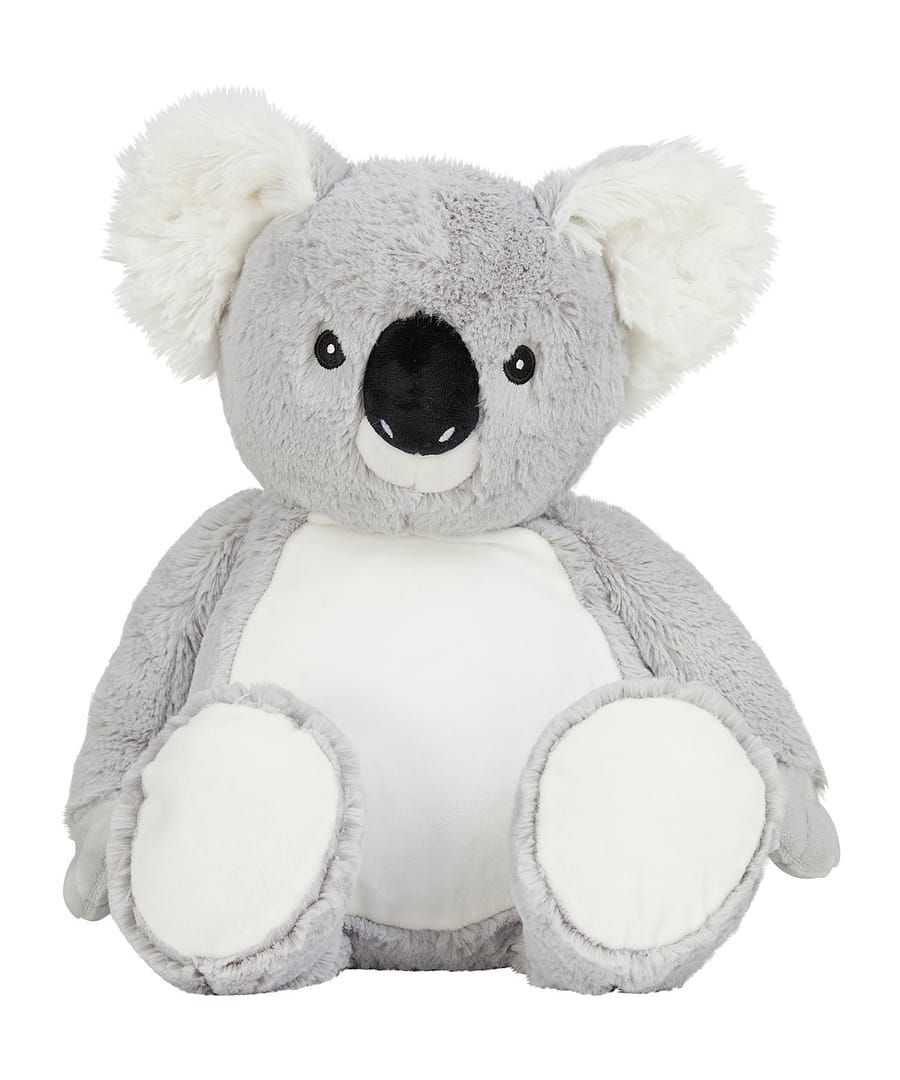 Soft plush Zippie koala bear with contrast nose and inner ears. Sewn eyes and mouth. White panel on tummy, perfect for decoration. Zip access on base for direct access onto the tummy for decoration. Removable inner stuffing. Can be embroidered, vinyl, and sublimation printed. Complies with EN71 European Toy Safety regulations. Remove all hang tags and their fasteners before giving this item to a child. Suitable for all ages.